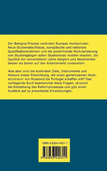 Der Bologna-Prozess verändert wie kein anderes Ereignis vor ihm die europäische Hochschullandschaft. Seit seinen Anfängen mit der Sorbonne-Erklärung im Mai 1998 sind dem Abkommen über 40 Staaten beigetreten und der durch ihn begründete Europäische Hochschulraum reicht heute vom Ural bis zum Atlantik und von der Barentssee bis zum Mittelmeer. Gleichzeitig geht der Prozess immer mehr in die Tiefe und nimmt direkten Einfluss nicht nur auf den Hochschulsektor, sondern auch auf den Arbeitsmarkt. Eines der wichtigsten Anliegen der Reformen, die Steigerung der "employability" mit einer Verkürzung der Studienzeiten, erfordern von Arbeitgebern wie Absolventen ein Umdenken und neue Beschäftigungsverhältnisse. Trotz seiner hohen Relevanz sind die Ziele, Methoden und Hintergründe des Reformprozesses an Hochschulen und in der Wirtschaft nahezu unbekannt. Lediglich zentrale und auffällige Elemente wie die neuen BA-/MA-Abschlüsse werden aktuell wahrgenommen und das, obwohl sie nur einen kleinen Teil des gesamten Bologna-Konzepts ausmachen. Dieses Buch bietet nun erstmals einen umfassenderen Einblick in die Entstehung, Zielsetzungen und Instrumente der Bologna-Erklärung und seiner Nachfolgekommuniqués, sowie auf Basis von Experteninterviews, einen Ausblick darauf, wie die Reformen die Hochschulen in den nächsten Jahren verändern könnten.