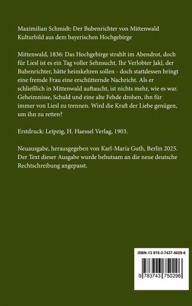 Maximilian Schmidt: Der Bubenrichter von Mittenwald. Kulturbild aus dem bayerischen Hochgebirge Mittenwald, 1836: Das Hochgebirge strahlt im Abendrot, doch für Liesl ist es ein Tag voller Sehnsucht. Ihr Verlobter Jakl, der Bubenrichter, hätte heimkehren sollen - doch stattdessen bringt eine fremde Frau eine erschütternde Nachricht. Als er schließlich in Mittenwald auftaucht, ist nichts mehr, wie es war. Geheimnisse, Schuld und eine alte Fehde drohen, ihn für immer von Liesl zu trennen. Wird die Kraft der Liebe genügen, um ihn zu retten? Erstdruck: Leipzig, H. Haessel Verlag, 1903. Neuausgabe, herausgegeben von Karl-Maria Guth, Berlin 2025. Der Text dieser Ausgabe wurde behutsam an die neue deutsche Rechtschreibung angepasst. Gesetzt aus der Minion Pro, 11 pt. Henricus - Edition Deutsche Klassik GmbH