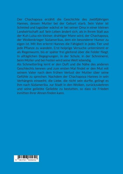 "Der Chachapoya" erzählt die Geschichte des zwölfjährigen Hannes, dessen Mutter bei der Geburt starb. Sein Vater ist Schmied und tagsüber wächst er bei der Oma in einer kleinen Landwirtschaft auf. Sein Leben ändert sich, als in ihrem Stall aus der Kuh Luisa ein kleiner, drahtiger Mann wird, der "Chachapoya", der Wolkenkrieger Südamerikas, dem ein besonderer Humor zu eigen ist. Mit ihm erlernt Hannes die Fähigkeit in jedes Tier und jede Pflanze zu wandeln. Erste holprige Versuche unternimmt er als Regenwurm, bis er später frei gleitend über die Felder fliegt. In alltäglichen Begegnungen, in der Schule, in der Schreinerei, beim Müller und bei Festen wird seine Welt lebendig. Als Schmetterling lernt er den Duft und die Nähe des anderen Geschlechts kennen und zum ersten Mal findet er den Mut mit dem Vater nach dem frühen Verlust der Mutter über seine Gefühle zu sprechen. Nachdem der Chachapoya Hannes in sein Verhängnis einweiht, die Liebe, die nicht sein durfte, gelingt es ihm nach Südamerika, zur Stadt in den Wolken, zurückzukehren und seine geliebte Geliebte zu bestatten, so dass sie Frieden inmitten ihrer Ahnen finden kann.