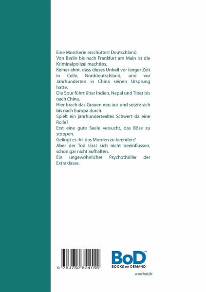 Eine Mordserie erschüttert Deutschland.Von Berlin bis nach Frankfurt am Main ist die Kriminalpolizei machtlos.Keiner ahnt, dass dieses Unheil vor langer Zeit in Celle, Norddeutschland, und vor Jahrhunderten in China seinen Ursprung hatte.Die Spur führt über Indien, Nepal und Tibet bis nach China.Hier brach das Grauen neu aus und setzte sich bis nach Europa durch.Spielt ein jahrhundertealtes Schwert da eine Rolle?Erst eine gute Seele versucht, das Böse zu stoppen.Gelingt es ihr, das Morden zu beenden?Aber der Tod lässt sich nicht beeinflussen, schon gar nicht aufhalten.Ein ungewöhnlicher Psychothriller der Extraklasse.