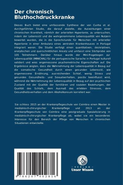 Dieses Buch bietet eine umfassende Synthese der von Cunha et al. durchgeführten Studie, die darauf abzielte, die Auswirkungen einer chronischen Krankheit, nämlich der arteriellen Hypertonie, zu untersuchen, indem der Lebensstil und die wahrgenommene Lebensqualität von Nutzern bewertet wurden, die in die Sprechstunde für Menschen mit arterieller Hypertonie in einer Ambulanz eines zentralen Krankenhauses in Portugal integriert waren. Die Studie verfolgt einen quantitativen, deskriptiven, analytischen und querschnittlichen Ansatz und umfasst eine Stichprobe von 105 Teilnehmern. Darüber hinaus wurde der Mini-Fragebogen zur Lebensqualität (MINICHAL) für die portugiesische Sprache in Portugal kulturell validiert und wies angemessene psychometrische Eigenschaften auf. Die Ergebnisse zeigten, dass die Wahrnehmung der Lebensqualität in Bezug auf die somatische Gesundheit durch einen gesunden Lebensstil, wie angemessene Ernährung, ausreichenden Schlaf, wenig Stress und gesundes Gesundheits- und Sexualverhalten, positiv beeinflusst wird, während die Wahrnehmung der Lebensqualität in Bezug auf den psychischen Zustand mit der Qualität der familiären und sozialen Beziehungen, der Qualität des Schlafs, dem Ausmaß des erlebten Stresses, dem Gesundheitsverhalten und dem Alkoholkonsum korreliert war.