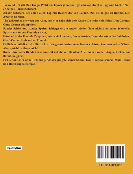 Traurend tief saß Don Diego, Wohl war keiner je so traurig; Gramvoll dacht er Tag' und Nächte Nur an seines Hauses Schmach. An die Schmach des edlen alten Tapfern Hauses der von Lainez, Das die Inigos an Ruhme, Die Abarcos übertraf. Tief gekränket, schwach vor Alter, Fühlt' er nahe sich dem Grabe, Da indes sein Feind Don Gormaz Ohne Gegner triumphiert. Sonder Schlaf und sonder Speise, Schläget er die Augen nieder, Tritt nicht über seine Schwelle, Spricht mit seinen Freunden nicht, Höret nicht der Freunde Zuspruch, Wenn sie kommen, ihn zu trösten; Denn der Atem des Entehrten, Glaubt' er, schände seinen Freund. Endlich schüttelt er die Bürde Los des grausam-stummen Grames, Lässet kommen seine Söhne, Aber spricht zu ihnen nicht; Bindet ihrer aller Hände Ernst und fest mit starken Banden; Alle, Tränen in den Augen, Flehen um Barmherzigkeit. Fast schon ist er ohne Hoffnung, Als der jüngste seiner Söhne, Don Rodrigo, seinem Mute Freud und Hoffnung wiedergab.