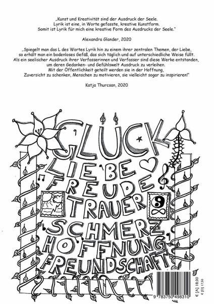 Kunst und Kreativität sind der Ausdruck der Seele.Lyrik ist eine, in Worte gefasste, kreative Kunstform.Somit ist Lyrik für mich eine kreative Form des Ausdrucks der Seele.Alexandra Glander, 2020Spiegelt man das L des Wortes Lyrik hin zu einem ihrer zentralen Themen, der Liebe,so erhält man ein bodenloses Gefäß, das sich täglich und auf unterschiedliche Weise füllt.Als ein seelischer Ausdruck ihrer Verfasserinnen und Verfasser sind diese Werke entstanden,um deren Gedanken- und Gefühlswelt Ausdruck zu verleihen. Mit der Öffentlichkeit geteilt werden sie in der Hoffnung, Zuversicht zu schenken, Menschen zu motivieren, sie vielleicht sogar zu inspirieren!Katja Thurcsan, 2020