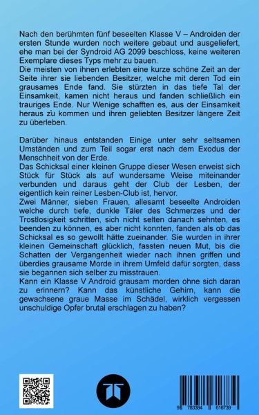 Nach den berühmten fünf beseelten Klasse V - Androiden der ersten Stunde wurden noch weitere gebaut und ausgeliefert, ehe man bei der Syndroid AG 2099 beschloss, keine weiteren Exemplare dieses Typs mehr zu bauen.Die meisten von ihnen erlebten eine kurze schöne Zeit an der Seite ihrer sie liebenden Besitzer, welche mit deren Tod ein grausames Ende fand. Sie stürzten in das tiefe Tal der Einsamkeit, kamen nicht heraus und fanden schließlich ein trauriges Ende. Nur Wenige schafften es, aus der Einsamkeit heraus zu kommen und ihren geliebten Besitzer längere Zeit zu überleben.Darüber hinaus entstanden Einige unter sehr seltsamen Umständen und zum Teil sogar erst nach dem Exodus der Menschheit von der Erde.Das Schicksal einer kleinen Gruppe dieser Wesen erweist sich Stück für Stück als auf wundersame Weise miteinander verbunden und daraus geht der Club der Lesben, der eigentlich kein reiner Lesben-Club ist, hervor.Zwei Männer, sieben Frauen, allesamt beseelte Androiden welche durch tiefe, dunkle Täler des Schmerzes und der Trostlosigkeit schritten, sich nicht selten danach sehnten, es beenden zu können, es aber nicht konnten, fanden als ob das Schicksal es so gewollt hätte zueinander. Sie wurden in ihrer kleinen Gemeinschaft glücklich, fassten neuen Mut, bis die Schatten der Vergangenheit wieder nach ihnen griffen und überdies grausame Morde in ihrem Umfeld dafür sorgten, dass sie begannen sich selber zu misstrauen. Kann ein Klasse V Android grausam morden ohne sich daran zu erinnern? Kann das künstliche Gehirn, kann die gewachsene graue Masse im Schädel, wirklich vergessen unschuldige Opfer brutal erschlagen zu haben?