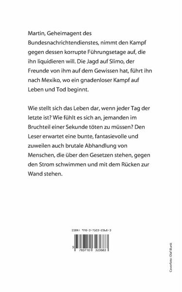 Martin, Geheimagent des Bundesnachrichtendienstes, nimmt den Kampf gegen dessen korrupte Führungsetage auf, die ihn liquidieren will. Die Jagd auf Slimo, der Freunde von ihm auf dem Gewissen hat, führt ihn nach Mexiko, wo ein gnadenloser Kampf auf Leben und Tod beginnt. Wie stellt sich das Leben dar, wenn jeder Tag der letzte ist? Wie fühlt es sich an, jemanden im Bruchteil einer Sekunde töten zu müssen? Den Leser erwartet eine bunte, fantasievolle und zuweilen auch brutale Abhandlung von Menschen, die über den Gesetzen stehen, gegen den Strom schwimmen und mit dem Rücken zur Wand stehen.