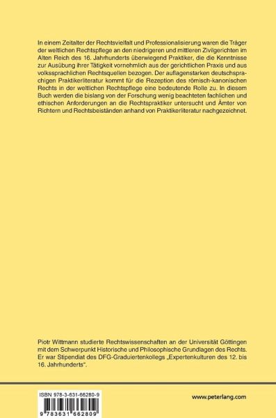 In einem Zeitalter der Rechtsvielfalt und Professionalisierung waren die Träger der weltlichen Rechtspflege an den niedrigeren und mittleren Zivilgerichten im Alten Reich des 16. Jahrhunderts überwiegend Praktiker, die die Kenntnisse zur Ausübung ihrer Tätigkeit vornehmlich aus der gerichtlichen Praxis und aus volkssprachlichen Rechtsquellen bezogen. Der auflagenstarken deutschsprachigen Praktikerliteratur kommt für die Rezeption des römisch-kanonischen Rechts in der weltlichen Rechtspflege eine bedeutende Rolle zu. In diesem Buch werden die bislang von der Forschung wenig beachteten fachlichen und ethischen Anforderungen an die Rechtspraktiker untersucht und Ämter von Richtern und Rechtsbeiständen anhand von Praktikerliteratur nachgezeichnet.