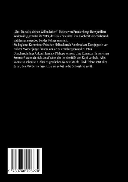 "Gut. Du sollst deinen Willen haben!" Helene von Frankenbergs Herz jubiliert. Widerwillig gestattet ihr Vater, dass sie erst einmal ihre Hochzeit verschiebt und stattdessen einen Job bei der Polizei annimmt. Sie begleitet Kommissar Friedrich Halbach nach Rossbrücken. Dort jagt ein verrückter Mörder junge Frauen, um sie zu verschleppen und zu töten. Gleich nach ihrer Ankunft lernt sie Philippe kennen. Eine Romanze für nur einen Sommer? Wenn da nicht Josef wäre, der ihr ebenfalls den Kopf verdreht. Alles könnte so schön sein. Aber es geschehen weitere Morde. Und Helene setzt alles daran, den Mörder zu fassen. Bis sie selbst in die Schusslinie gerät.