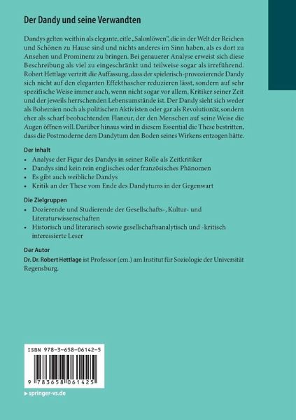 Dandys gelten weithin als elegante, eitle Salonlöwen , die in der Welt der Reichen und Schönen zu Hause sind und nichts anderes im Sinn haben, als es dort zu Ansehen und Prominenz zu bringen. Bei genauerer Analyse erweist sich diese Beschreibung als viel zu eingeschränkt und teilweise sogar als irreführend. Robert Hettlage vertritt die Auffassung, dass der spielerisch-provozierende Dandy sich nicht auf den eleganten Effekthascher reduzieren lässt, sondern auf sehr spezifische Weise immer auch, wenn nicht sogar vor allem, Kritiker seiner Zeit und der jeweils herrschenden Lebensumstände ist. Der Dandy sieht sich weder als Bohemien noch als politischen Aktivisten oder gar als Revolutionär, sondern eher als scharf beobachtenden Flaneur, der den Menschen auf seine Weise die Augen öffnen will. Darüber hinaus wird in diesem Essential die These bestritten, dass die Postmoderne dem Dandytum den Boden seines Wirkens entzogen hätte.