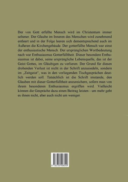 Der von Gott erfüllte Mensch wird im Christentum immer seltener. Der Glaube im Inneren des Menschen wird zunehmend entleert und in der Folge leeren sich dementsprechend auch im Äußeren die Kirchengebäude. Der gotterfüllte Mensch war einst der enthusiastische Mensch. Der ursprünglichen Wortbedeutung nach war Enthusiasmus Gotterfülltheit. Dieser besondere Enthusiasmus ist dabei, seine ursprüngliche Lebensquelle, das ist der Geist Gottes, im Gläubigen zu verlieren. Der Grund für diesen drohenden Verlust ist nicht in der Schrift anzusiedeln, sondern im Zeitgeist, was in den vorliegenden Tischgesprächen deutlich werden soll. Tatsächlich ist die Schrift imstande, den Glauben mit dieser Gotterfülltheit anzureichern, sofern man von ihrem besonderen Enthusiasmus ergriffen wird. Vielleicht können die Gespräche dazu einen Beitrag leisten - um mehr geht es ihnen nicht, aber auch nicht um weniger.Herausgeber: Hans-Jürgen Sträter, Adlerstein Verlag
