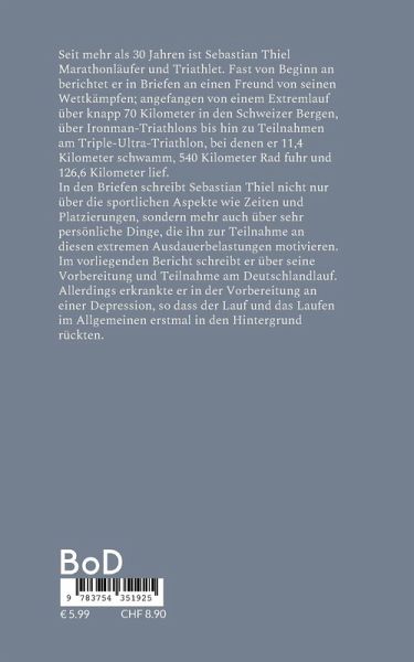 Seit mehr als 30 Jahren ist Sebastian Thiel Marathonläufer und Triathlet. Fast von Beginn an berichtet er in Briefen an einen Freund von seinen Wettkämpfen; angefangen von einem Extremlauf über knapp 70 Kilometer in den Schweizer Bergen, über Ironman-Triathlons bis hin zu Teilnahmen am Triple-Ultra-Triathlon, bei denen er 11,4 Kilometer schwamm, 540 Kilometer Rad fuhr und 126,6 Kilometer lief.In den Briefen schreibt Sebastian Thiel nicht nur über die sportlichen Aspekte wie Zeiten und Platzierungen, sondern mehr auch über sehr persönliche Dinge, die ihn zur Teilnahme an diesen extremen Ausdauerbelastungen motivieren.Im vorliegenden Bericht schreibt er über seine Vorbereitung und Teilnahme am Deutschlandlauf. Allerdings erkrankte er in der Vorbereitung an einer Depression, so dass der Lauf und das Laufen im Allgemeinen erstmal in den Hintergrund rückten.