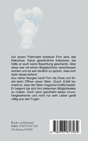 Auf einem Flohmarkt entdeckt Finn eine alte Keksdose. Keine gewöhnliche Keksdose, der hätte er auch keine Beachtung geschenkt. Aber diese war mit einem Bügelschloss verschlossen worden und es war deutlich zu spüren, dass sich darin etwas befand.Aus reiner Neugier kauft Finn die Dose und findet beim Öffnen einen Stein. Durch Zufall bemerkt er, dass der Stein magische Kräfte besitzt. Er beginnt die sich ihm bietenden Möglichkeiten zu nutzen. Doch dann geschieht etwas Unvorhergesehenes und nicht nur sein Leben gerät völlig aus den Fugen.