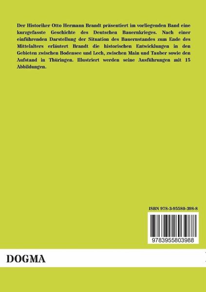 Der Historiker Otto Hermann Brandt präsentiert im vorliegenden Band eine kurzgefasste Geschichte des Deutschen Bauernkrieges. Nach einer einführenden Darstellung der Situation des Bauernstandes zum Ende des Mittelalters erläutert Brandt die historischen Entwicklungen in den Gebieten zwischen Bodensee und Lech, zwischen Main und Tauber sowie den Aufstand in Thüringen. Illustriert werden seine Ausführungen mit 15 Abbildungen.