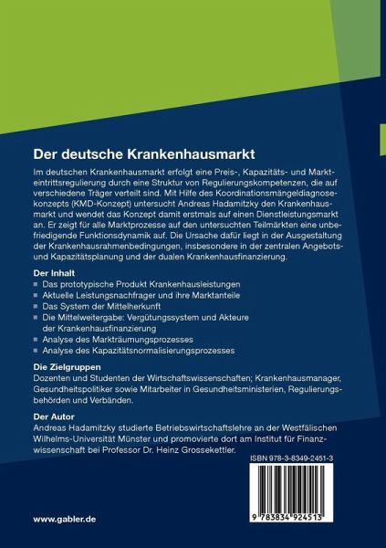 Im deutschen Krankenhausmarkt erfolgt eine Preis-, Kapazitäts- und Markteintrittsregulierung durch eine Struktur von Regulierungskompetenzen, die auf verschiedene Träger verteilt sind. Mit Hilfe des Koordinationsmängeldiagnosekonzepts (KMD-Konzept) untersucht Andreas Hadamitzky den Krankenhausmarkt und wendet das Konzept damit erstmals auf einen Dienstleistungsmarkt an. Er zeigt für alle Marktprozesse auf den untersuchten Teilmärkten eine unbefriedigende Funktionsdynamik auf. Die Ursache dafür liegt in der Ausgestaltung der Krankenhausrahmenbedingungen, insbesondere in der zentralen Angebots- und Kapazitätsplanung und der dualen Krankenhausfinanzierung.