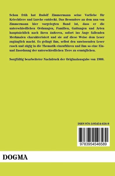 Schon früh hat Rudolf Zimmermann seine Vorliebe für Kriechtiere und Lurche entdeckt. Das Besondere an dem nun von Zimmermann hier vorgelegten Band ist, dass er die unterschiedlichen Ordnungen, Familien, Gattungen und Arten hauptsächlich nach ihren äußeren, sofort ins Auge fallenden Merkmalen charakterisiert und sie auf diese Weise dem Leser zugänglich macht. Es gelingt ihm, selbst den unwissenden Leser rasch und zügig in die Thematik einzuführen und ihm so eine Ein- und Zuordnung der unterschiedlichen Tiere zu ermöglichen.