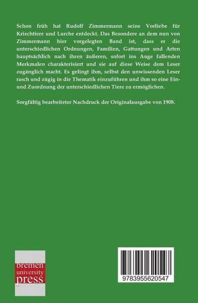 Schon früh hat Rudolf Zimmermann seine Vorliebe für Kriechtiere und Lurche entdeckt. Das Besondere an dem nun von Zimmermann hier vorgelegten Band ist, dass er die unterschiedlichen Ordnungen, Familien, Gattungen und Arten hauptsächlich nach ihren äußeren, sofort ins Auge fallenden Merkmalen charakterisiert und sie auf diese Weise dem Leser zugänglich macht. Es gelingt ihm, selbst den unwissenden Leser rasch und zügig in die Thematik einzuführen und ihm so eine Ein- und Zuordnung der unterschiedlichen Tiere zu ermöglichen.