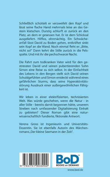 Schließlich schüttelt er verzweifelt den Kopf und lässt seine flache Hand mehrmals leise an das Gestein klatschen. Durstig schlurft er zurück an den Platz, an dem er gesessen hat. Er ist dem Schicksal ausgeliefert. Hilflos, ohnmächtig. Ein Schwächeanfall lässt David zu Boden gehen, entkräftet sinkt sein Kopf an die Wand. Noch einmal fleht er: "Bitte, nicht so!" Dann kehrt die Stille zurück in die Felsspalte. Und mit ihr die pechschwarze Nacht.Die Fahrt zum todkranken Vater wird für den gestressten David und seinen pubertierenden Sohn Simon eine Reise zu sich selbst. In der Einfachheit des Lebens in den Bergen stellt sich David seinen Schuldgefühlen und Simon entdeckt während eines gefährlichen Sturms, dass seine Hyperaktivitätsstörung Ausdruck einer außergewöhnlichen Fähigkeit ist.Wir leben in einer elektrifizierten, technisierten Welt. Was würde geschehen, wenn die Natur - in aller Stille - bereits damit begonnen hätte, unserem Streben nach umfassender Digitalisierung Einhalt zugebieten?Dieser Roman gibt eine naturwissenschaftlich fundierte, fiktionale Antwort.