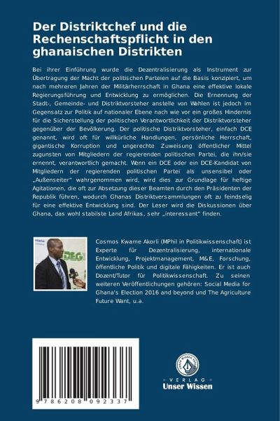 Bei ihrer Einführung wurde die Dezentralisierung als Instrument zur Übertragung der Macht der politischen Parteien auf die Basis konzipiert, um nach mehreren Jahren der Militärherrschaft in Ghana eine effektive lokale Regierungsführung und Entwicklung zu ermöglichen. Die Ernennung der Stadt-, Gemeinde- und Distriktvorsteher anstelle von Wahlen ist jedoch im Gegensatz zur Politik auf nationaler Ebene nach wie vor ein großes Hindernis für die Sicherstellung der politischen Verantwortlichkeit der Distriktvorsteher gegenüber der Bevölkerung. Der politische Distriktvorsteher, einfach DCE genannt, wird oft für willkürliche Handlungen, persönliche Herrschaft, gigantische Korruption und ungerechte Zuweisung öffentlicher Mittel zugunsten von Mitgliedern der regierenden politischen Partei, die ihn/sie ernennt, verantwortlich gemacht. Wenn ein DCE oder ein DCE-Kandidat von Mitgliedern der regierenden politischen Partei als unsensibel oder "Außenseiter" wahrgenommen wird, wird dies zur Grundlage für heftige Agitationen, die oft zur Absetzung dieser Beamten durch den Präsidenten der Republik führen, wodurch Ghanas Distriktversammlungen oft zu feindselig für eine effektive Entwicklung sind. Der Leser wird die Diskussionen über Ghana, das wohl stabilste Land Afrikas, sehr "interessant" finden.