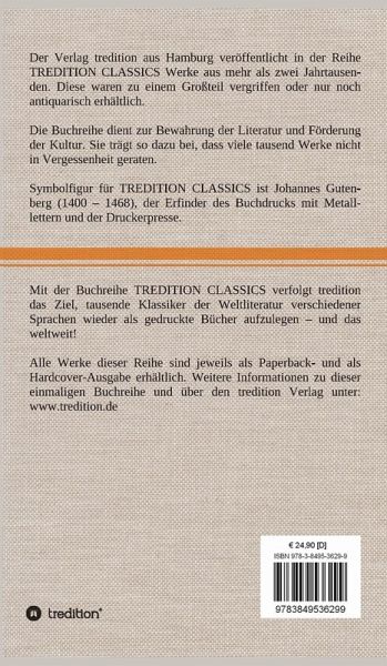 Diese Hardcover-Ausgabe ist Teil der TREDITION CLASSICS. Der Verlag tredition aus Hamburg veröffentlicht in der Buchreihe TREDITION CLASSICS Werke aus mehr als zwei Jahrtausenden. Diese waren zu einem Großteil vergriffen oder nur noch antiquarisch erhältlich. Mit TREDITION CLASSICS verfolgt tredition das Ziel, tausende Klassiker der Weltliteratur verschiedener Sprachen wieder als gedruckte Bücher zu verlegen und das weltweit! Die Buchreihe dient zur Bewahrung der Literatur und Förderung der Kultur. Sie trägt so dazu bei, dass viele tausend Werke nicht in Vergessenheit geraten.