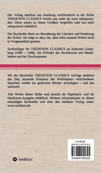 Diese Hardcover-Ausgabe ist Teil der TREDITION CLASSICS. Der Verlag tredition aus Hamburg veröffentlicht in der Buchreihe TREDITION CLASSICS Werke aus mehr als zwei Jahrtausenden. Diese waren zu einem Großteil vergriffen oder nur noch antiquarisch erhältlich. Mit TREDITION CLASSICS verfolgt tredition das Ziel, tausende Klassiker der Weltliteratur verschiedener Sprachen wieder als gedruckte Bücher zu verlegen und das weltweit! Die Buchreihe dient zur Bewahrung der Literatur und Förderung der Kultur. Sie trägt so dazu bei, dass viele tausend Werke nicht in Vergessenheit geraten.