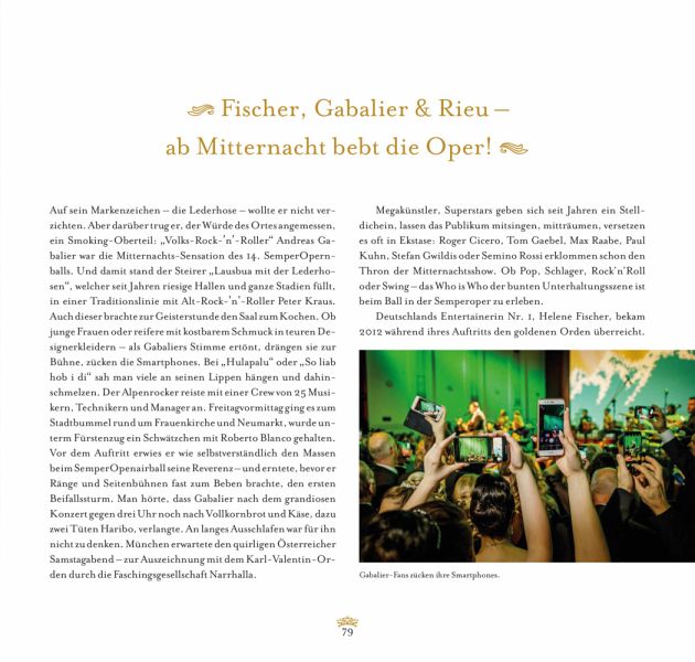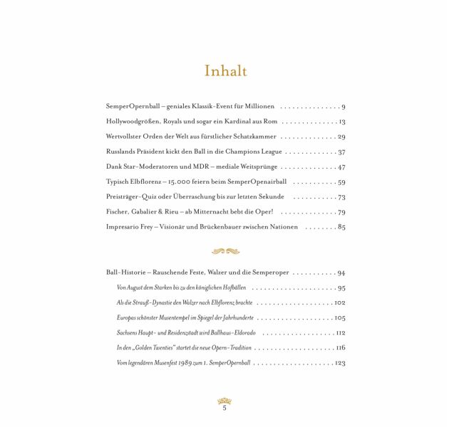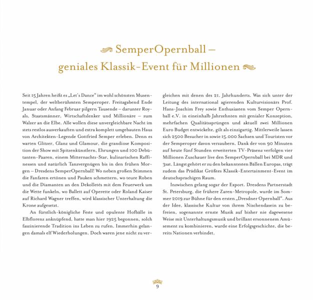 Der Dresdner SemperOpernball in Europas wohl schönstem Musentempel zählt seit Jahren zu den wichtigsten Klassik-Entertainment-Events. Er knüpft an eine Tradition an, die 1925 begann. Seit 2006 vereint der Ball alljährlich rund 2500 Gäste, zu denen Hollywood-Stars, Milliardäre, Monarchen wie Schwedens Königin Silvia oder Fürst Albert II. von Monaco und Staatsmänner wie Wladimir Putin zählen. Mit faszinierender Show, fünfstündiger Live-Übertragung im TV, Verleihung goldener Orden sowie 15.000 Dresdnern und Touristen beim Open-Air-Ball vor der Oper ist er einzigartig. Atemberaubende Momente lässt der opulent illustrierte Band noch einmal Revue passieren, erzählt von den je 100 Debütantenpaaren, weltberühmten Künstlern und Protagonisten um Impresario Hans-Joachim Frey.