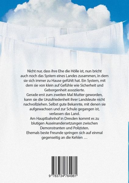 Nicht nur, dass ihre Ehe die Hölle ist, nun bricht auch noch das System eines Landes zusammen, in dem sie sich immer zu Hause gefühlt hat. Ein System, mit dem sie von klein auf Gefühle wie Sicherheit und Geborgenheit assoziierte.Gerade erst zum zweiten Mal Mutter geworden, kann sie die Unzufriedenheit ihrer Landsleute nicht nachvollziehen. Selbst gute Bekannte, mit denen sie aufgewachsen und zur Schule gegangen ist, verlassen das Land.Am Hauptbahnhof in Dresden kommt es zu blutigen Auseinandersetzungen zwischen Demonstranten und Polizisten.Ehemals beste Freunde springen sich auf einmal gegenseitig an die Kehlen ...Und zu den täglichen Auseinandersetzungen mit ihrem Mann kommen nun auch noch immense Zukunftsängste.