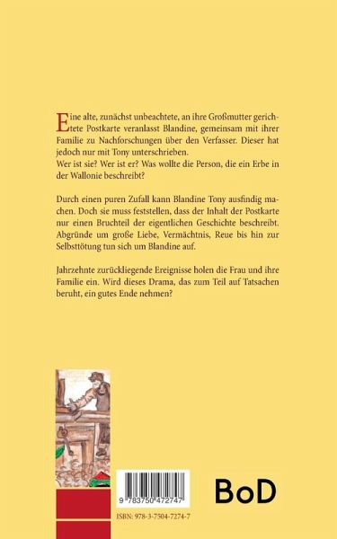 Eine alte, zunächst unbeachtete, an ihre Großmutter gerichtete Postkarte veranlasst Blandine, gemeinsam mit ihrer Familie zu Nachforschungen über den Verfasser. Dieser hat jedoch nur mit Tony unterschrieben.Wer ist sie? Wer ist er? Was wollte die Person, die ein Erbe in der Wallonie beschreibt?Durch einen puren Zufall kann Blandine Tony ausfindig machen. Doch sie muss feststellen, dass der Inhalt der Postkarte nur einen Bruchteil der eigentlichen Geschichte beschreibt. Abgründe um große Liebe, Vermächtnis, Reue bis hin zur Selbsttötung tun sich um Blandine auf.Jahrzehnte zurückliegende Ereignisse holen die Frau und ihre Familie ein. Wird dieses Drama, das zum Teil auf Tatsachen beruht, ein gutes Ende nehmen?