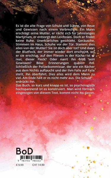 Es ist die alte Frage von Schuld und Sühne, von Reue und Gewissen nach einem Verbrechen. Ein Mann erschlägt seine Mutter, er rächt sich für jahrelanges Martyrium, er entsorgt den Leichnam. Doch er findet keine Ruhe. Unerklärliches geschieht. Geräusche, Stimmen im Haus, Schuhe vor der Tür. Stammt dies alles von der Mutter? Sie ist doch aber tot? Und dann der Blutfleck, der immer wieder dort erscheint, wo er sie erschlug, auf den Fliesen in der Küche. Ist er real, dieser Fleck? Oder narrt ihn bloß sein Gewissen? Böse Erinnerungen quälen ihn. Schließlich der Polizeikommissar, der wie ein Rächer aus dem Nichts auftaucht und der ihm Falle auf Falle stellt, ihn überführt. Dies alles wird dem Mann zu viel. Am Ende hält er es nicht mehr aus. Die Schuld erdrückt ihn. Das Buch, so kurz und knapp es ist, so psychologisch hochspannend ist es konstruiert. Man wird förmlich eingesogen von diesem Text, kommt nicht los davon.