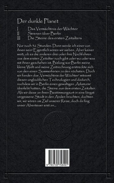Der dunkle PlanetI Das Vermächtnis der Wächter II Sirenen über Berlin III Die Steine des ersten Zeitalters Nur noch 36 Stunden. Dann werde ich einer von ihnen sein! Eigentlich wären wir sieben. Aber keiner weiß, ob es die anderen drei oder ihre Nachfahren aus dem ersten Zeitalter noch gibt oder wo oder was mit ihnen geschehen ist. Bislang war Berlin meine kleine Welt und meine Zeitrechnung erstreckte sich von den einen Sommerferien zu den nächsten. Doch wir fanden das 'Vermächtnis der Wächter' mitsamt diesen unglaublichen Technologien und dadurch, nachdem wir in Berlin einen gewaltigen…mehr