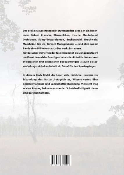 Das große Naturschutzgebiet Duvenstedter Brook ist ein besonderes Gebiet: Kraniche, Blaukehlchen, Hirsche, Marderhund, Orchideen, Sumpfdotterblumen, Buchenwald, Bruchwald, Moorheide, Wiesen, Tümpel, Moorgewässer ... und alles das am Rande einer Millionenstadt. - Das weckt Erstaunen. Für Besucher immer wieder faszinierend ist die Jungenaufzucht der Kraniche und das Brunftgeschehen des Rotwilds. Neben ornithologischen und botanischen Beobachtungen ist auch die abwechslungsreiche Landschaft ein Genuß für den Spaziergänger. In diesem Buch findet der Leser viele nützliche Hinweise zur Erkundung des Naturschutzgebietes, Wissenswertes über Besitzverhältnisse und Landschaftsentwicklung. Vielleicht mag er eine Ahnung bekommen von der Schutzbedürftigkeit dieses einzigartigen Gebietes.
