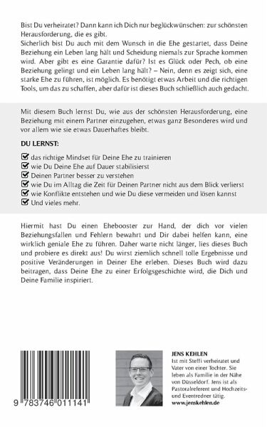 Bist Du verheiratet? Dann kann ich Dich nur beglückwünschen: zur schönsten Herausforderung, die es gibt. Sicherlich bist Du auch mit dem Wunsch in die Ehe gestartet, dass Deine Beziehung ein Leben lang hält und Scheidung niemals zur Sprache kommen wird. Aber gibt es eine Garantie dafür? Ist es Glück oder Pech, ob eine Beziehung gelingt und ein Leben lang hält? Nein, denn es zeigt sich, eine starke Ehe zu führen, ist möglich. Es benötigt etwas Arbeit und die richtigen Tools, um das zu schaffen, aber dafür ist dieses Buch schließlich auch gedacht. Mit diesem Buch lernst Du, wie aus der schönsten Herausforderung, eine Beziehung mit einem Partner einzugehen, etwas ganz Besonderes wird und vor allem wie sie etwas Dauerhaftes bleibt.Du lernst: das richtige Mindset für Deine Ehe zu trainierenDu lernst: wie Du Deine Ehe auf Dauer stabilisierstDu lernst: Deinen Partner besser zu verstehenDu lernst: wie Du im Alltag die Zeit für Deinen Partner nicht aus dem Blick verlierstDu lernst: wie Konflikte entstehen und wie Du diese vermeiden und lösen kannstUnd vieles mehr.Hiermit hast Du einen Ehebooster zur Hand, der dich vor vielen Beziehungsfallen und Fehlern bewahrt und Dir dabei helfen kann, eine wirklich geniale Ehe zu führen. Daher warte nicht länger, lies dieses Buch und probiere es direkt aus! Du wirst ziemlich schnell tolle Ergebnisse und positive Veränderungen in Deiner Ehe erleben. Dieses Buch wird dazu beitragen, dass Deine Ehe zu einer Erfolgsgeschichte wird, die Dich und Deine Familie inspiriert.