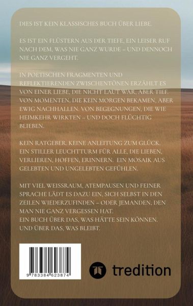 "Der eine Kaffee" ist ein poetisches Mosaik aus Momenten, die nie laut waren - aber bleiben. Es erzählt von einer Liebe, die nicht zu Ende ging, weil sie nie richtig begann, und doch Spuren im Leben hinterließ. In fragmentarischen Texten, feinen Andeutungen und stillen Wahrheiten begleitet dieses Buch all jene, die lieben, erinnern, vermissen - oder einfach zwischen den Zeilen lesen möchten. Für Herzmenschen. Für Sehnsuchtsleser. Für dich.