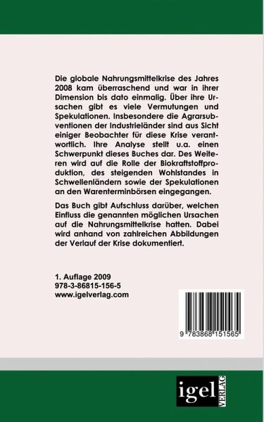 Die globale Nahrungsmittelkrise des Jahres 2008 kam überraschend und war in ihrer Dimension bis dato einmalig. Über ihre Ursachen gibt es viele Vermutungen und Spekulationen. Insbesondere die Agrarsubventionen der Industrieländer sind aus Sicht einiger Beobachter für diese Krise verantwortlich. Ihre Analyse stellt u.a. einen Schwerpunkt dieses Buches dar. Des Weiteren wird auf die Rolle der Biokraftstoffproduktion, des steigenden Wohlstandes in Schwellenländern sowie der Spekulationen an den Warenterminbörsen eingegangen. Das Buch gibt Aufschluss darüber, welchen Einfluss die genannten möglichen Ursachen auf die Nahrungsmittelkrise hatten. Dabei wird anhand von zahlreichen Abbildungen der Verlauf der Krise dokumentiert.