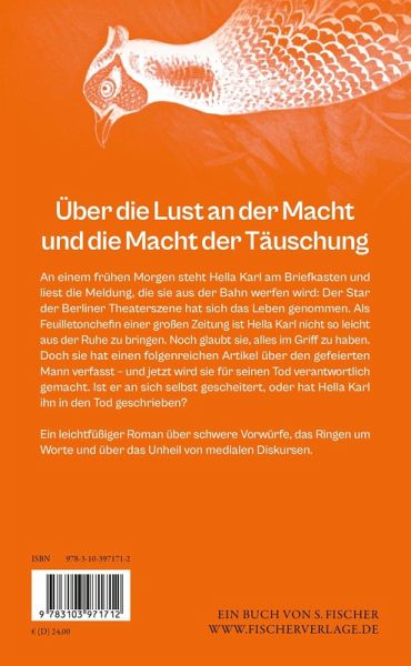 An einem frühen Morgen steht Hella Karl am Briefkasten und liest die Meldung, die sie aus der Bahn werfen wird: Der Star der Berliner Theaterszene und Gravitationszentrum der Kulturwelt hat sich das Leben genommen. Hella Karl, Feuilletonchefin einer großen Zeitung, ist nicht so leicht aus der Ruhe zu bringen und glaubt, alles im Griff zu haben. Doch sie hat einen folgenreichen Artikel über den gefeierten Mann verfasst - und jetzt wird sie für seinen Tod verantwortlich gemacht. Ist er an sich selbst gescheitert, oder hat Hella Karl ihn in den Tod geschrieben?