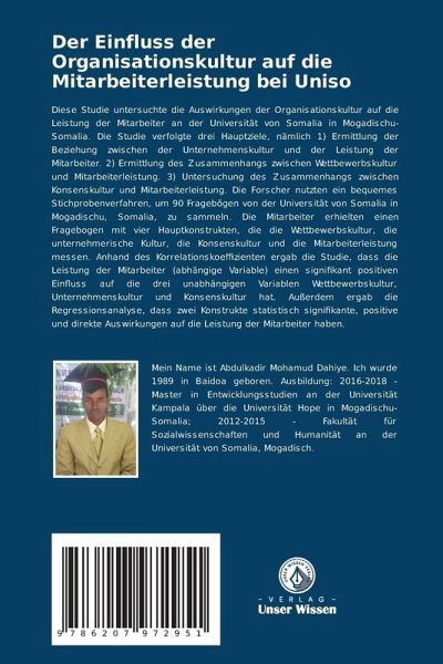 Diese Studie untersuchte die Auswirkungen der Organisationskultur auf die Leistung der Mitarbeiter an der Universität von Somalia in Mogadischu-Somalia. Die Studie verfolgte drei Hauptziele, nämlich 1) Ermittlung der Beziehung zwischen der Unternehmenskultur und der Leistung der Mitarbeiter. 2) Ermittlung des Zusammenhangs zwischen Wettbewerbskultur und Mitarbeiterleistung. 3) Untersuchung des Zusammenhangs zwischen Konsenskultur und Mitarbeiterleistung. Die Forscher nutzten ein bequemes Stichprobenverfahren, um 90 Fragebögen von der Universität von Somalia in Mogadischu, Somalia, zu sammeln. Die Mitarbeiter erhielten einen Fragebogen mit vier Hauptkonstrukten, die die Wettbewerbskultur, die unternehmerische Kultur, die Konsenskultur und die Mitarbeiterleistung messen. Anhand des Korrelationskoeffizienten ergab die Studie, dass die Leistung der Mitarbeiter (abhängige Variable) einen signifikant positiven Einfluss auf die drei unabhängigen Variablen Wettbewerbskultur, Unternehmenskultur und Konsenskultur hat. Außerdem ergab die Regressionsanalyse, dass zwei Konstrukte statistisch signifikante, positive und direkte Auswirkungen auf die Leistung der Mitarbeiter haben.