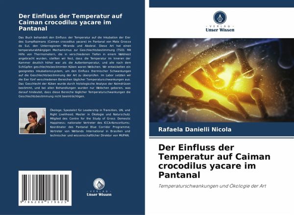 Das Buch behandelt den Einfluss der Temperatur auf die Inkubation der Eier des Sumpfkaimans (Caiman crocodilus yacare) im Pantanal von Mato Grosso do Sul, den Unterregionen Miranda und Abobral. Diese Art hat einen temperaturabhängigen Mechanismus zur Geschlechtsbestimmung (TSD). Mit Hilfe von Thermometern, die in verschiedenen Tiefen in einem Waldnest angebracht wurden, stellten wir fest, dass die Temperatur im Inneren der Kammer deutlich höher war als die Außentemperatur, und alle nach dem Schlüpfen geschlechtsbestimmten Küken waren Weibchen. Wir entwickelten ein geeignetes Inkubationssystem, um den Einfluss thermischer Schwankungen auf die Geschlechtsbestimmung der Art zu überprüfen. Im Labor setzten wir die Eier fünf verschiedenen Bereichen täglicher Temperaturschwankungen aus. Das Geschlecht der Küken wurde durch histologische Analyse der Keimdrüsen bestimmt, und bei allen Behandlungen wurden nur Weibchen geboren, was darauf hindeutet, dass diese Bereiche täglicher Temperaturschwankungen die Geschlechtsbestimmung nicht beeinträchtigen.