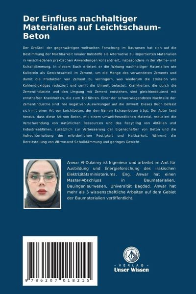 Der Großteil der gegenwärtigen weltweiten Forschung im Bauwesen hat sich auf die Bestimmung der Machbarkeit lokaler Rohstoffe als Alternative zu importierten Materialien in verschiedenen praktischen Anwendungen konzentriert, insbesondere in der Wärme- und Schalldämmung. In diesem Buch erörtert er die Wirkung nachhaltiger Materialien wie Kalkstein als Gewichtsanteil im Zement, um die Menge des verwendeten Zements und damit die Produktion von Zement zu verringern, was wiederum die Emission von Kohlendioxidgas reduziert und somit die Umwelt belastet. Krankheiten, die durch die Zementindustrie und den Umgang mit Zement entstehen, sind gleichbedeutend mit ernsthaften Krankheiten, die zum Tod führen. Einer der schwerwiegendsten Nachteile der Zementindustrie sind ihre negativen Auswirkungen auf die Umwelt. Dieses Buch befasst sich mit einer Art von Leichtbeton, der den Namen Schaumbeton trägt. Der Autor fand heraus, dass diese Art von Beton, mit einem umweltfreundlichen Material, reduziert die Verschwendung von natürlichen Ressourcen und das Recycling von Abfällen und Industrieabfällen, zusätzlich zur Verbesserung der Eigenschaften von Beton und die Aufrechterhaltung der erforderlichen Festigkeit und Haltbarkeit, Während die Bereitstellung von Wärme-und Schalldämmung und geringes Gewicht.