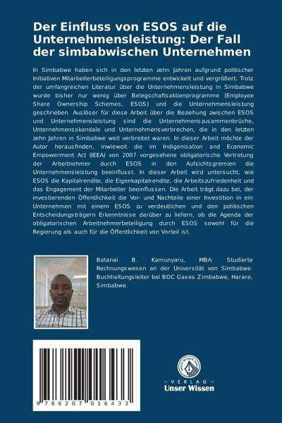 In Simbabwe haben sich in den letzten zehn Jahren aufgrund politischer Initiativen Mitarbeiterbeteiligungsprogramme entwickelt und vergrößert. Trotz der umfangreichen Literatur über die Unternehmensleistung in Simbabwe wurde bisher nur wenig über Belegschaftsaktienprogramme (Employee Share Ownership Schemes, ESOS) und die Unternehmensleistung geschrieben. Auslöser für diese Arbeit über die Beziehung zwischen ESOS und Unternehmensleistung sind die Unternehmenszusammenbrüche, Unternehmensskandale und Unternehmensverbrechen, die in den letzten zehn Jahren in Simbabwe weit verbreitet waren. In dieser Arbeit möchte der Autor herausfinden, inwieweit die im Indigenisation and Economic Empowerment Act (IEEA) von 2007 vorgesehene obligatorische Vertretung der Arbeitnehmer durch ESOS in den Aufsichtsgremien die Unternehmensleistung beeinflusst. In dieser Arbeit wird untersucht, wie ESOS die Kapitalrendite, die Eigenkapitalrendite, die Arbeitszufriedenheit und das Engagement der Mitarbeiterbeeinflussen. Die Arbeit trägt dazu bei, der investierenden Öffentlichkeit die Vor- und Nachteile einer Investition in ein Unternehmen mit einem ESOS zu verdeutlichen und den politischen Entscheidungsträgern Erkenntnisse darüber zu liefern, ob die Agenda der obligatorischen Arbeitnehmerbeteiligung durch ESOS sowohl für die Regierung als auch für die Öffentlichkeit von Vorteil ist.