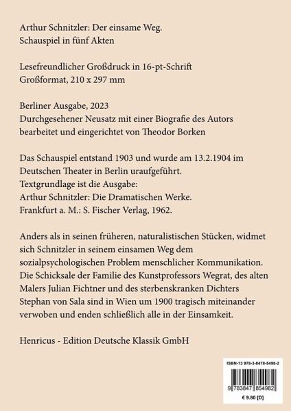 Arthur Schnitzler: Der einsame Weg. Schauspiel in fünf AktenLesefreundlicher Großdruck in 16-pt-SchriftAnders als in seinen früheren, naturalistischen Stücken, widmet sich Schnitzler in seinem einsamen Weg dem sozialpsychologischen Problem menschlicher Kommunikation. Die Schicksale der Familie des Kunstprofessors Wegrat, des alten Malers Julian Fichtner und des sterbenskranken Dichters Stephan von Sala sind in Wien um 1900 tragisch miteinander verwoben und enden schließlich alle in der Einsamkeit.Großformat, 210 x 297 mmBerliner Ausgabe, 2023Durchgesehener Neusatz mit einer Biografie des Autors bearbeitet und eingerichtet von Theodor BorkenDas Schauspiel entstand 1903 und wurde am 13.2.1904 im Deutschen Theater in Berlin uraufgeführt.Textgrundlage ist die Ausgabe:Arthur Schnitzler: Die Dramatischen Werke. Frankfurt a.M.: S. Fischer Verlag, 1962.Umschlagabbildung: Richard Bergh, Nach der Sitzung (Ausschnitt), 1884Gesetzt aus der Minion Pro, 16 pt.Henricus - Edition Deutsche Klassik GmbHÜber den Autor:1862 in eine begüterte jüdische Arztfamilie in Wien hineingeboren studiert Arthur Schnitzler selbst Medizin und betreibt nach kurzen Krankenhausjahren eine Privatpraxis, die er mit zunehmender literarischer Tätigkeit immer weiter reduziert. Er lernt Sigmund Freud kennen und begeistert sich für dessen Studien zum Un- und Unterbewussten. Gemeinsam mit Hugo von Hofmannsthal gilt er als Kern der »Wiener Moderne« und ist einer der bedeutendsten Kritiker seiner Zeit. Mit der Novelle »Leutnant Gustl« führt er den inneren Monolog, die seinen Figuren assoziative Reaktionen auf ihre Umwelt ermöglichen, in die deutsche Literatur ein. Seine Montagetechnik verwebt Klischees und vermeintlich individuelle Reaktionen zu einem überindividuellen Typus. Egoistische Flucht vor Verantwortung und Bindungsängste sind zentrale Themen seines umfangreichen Werkes. Nachdem ihm 1921 nach einem Skandal um seinen »Reigen« die Aufführungsgenehmigung entzogen wird, ernennt ihn der österreichische PEN-Club 1923 zu seinem Präsidenten. Drei Jahre später erhält er den Burgtheaterring und gehört zu den meistgespielten Dramatikern auf deutschen Bühnen, als er 1931 in Wien an einer Gehirnblutung stirbt.