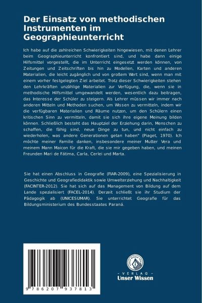 Ich habe auf die zahlreichen Schwierigkeiten hingewiesen, mit denen Lehrer beim Geographieunterricht konfrontiert sind, und habe dann einige Hilfsmittel vorgestellt, die im Unterricht eingesetzt werden können, von Zeitungen und Zeitschriften bis hin zu Modellen, Karten und anderen Materialien, die leicht zugänglich und von großem Wert sind, wenn man mit einem vorher festgelegten Ziel arbeitet. Trotz dieser Schwierigkeiten stehen den Lehrkräften unzählige Materialien zur Verfügung, die, wenn sie in methodische Hilfsmittel umgewandelt werden, wesentlich dazu beitragen, das Interesse der Schüler zu steigern. Als Lehrer müssen wir immer nach anderen Mitteln und Methoden suchen, um Wissen zu vermitteln, indem wir die verfügbaren Materialien und Räume nutzen, um den Schülern einen kritischen Sinn zu vermitteln, damit sie sich ihre eigene Meinung bilden können. Schließlich besteht das Hauptziel der Erziehung darin, Menschen zu schaffen, die fähig sind, neue Dinge zu tun, und nicht einfach zu wiederholen, was andere Generationen getan haben" (Piaget, 1970). Ich möchte meiner Familie danken, insbesondere meiner Mutter Vera und meinem Mann Maicon für die Kraft, die sie mir gegeben haben, und meinen Freunden Mari de Fátima, Carla, Cerlei und Marta.