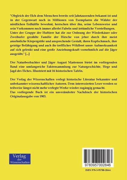 Der Naturbeobachter und Jäger August Martenson bietet im vorliegenden Band eine umfangreiche Faktensammlung zur Naturgeschichte, Hege und Jagd des Elches. Illustriert mit 16 historischen Tafeln.