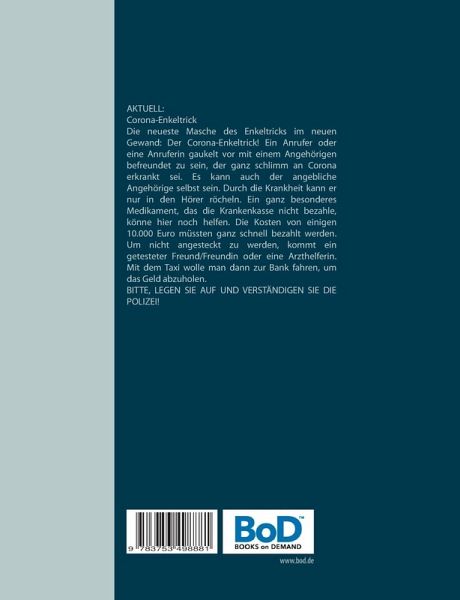 AKTUELL:Corona-EnkeltrickDie neueste Masche des Enkeltricks im neuen Gewand: Der Corona-Enkeltrick! Ein Anrufer oder eine Anruferin gaukelt vor mit einem Angehörigen befreundet zu sein, der ganz schlimm an Corona erkrankt sei. Es kann auch der angebliche Angehörige selbst sein. Durch die Krankheit kann er nur in den Hörer röcheln. Ein ganz besonderes Medikament, das die Krankenkasse nicht bezahle, könne hier noch helfen. Die Kosten von einigen 10.000 Euro müssten ganz schnell bezahlt werden. Um nicht angesteckt zu werden, kommt ein getesteter Freund/Freundin oder eine Arzthelferin. Mit dem Taxi wolle man dann zur Bank fahren, um das Geld abzuholen. BITTE, LEGEN SIE AUF UND VERSTÄNDIGEN SIE DIE POLIZEI!