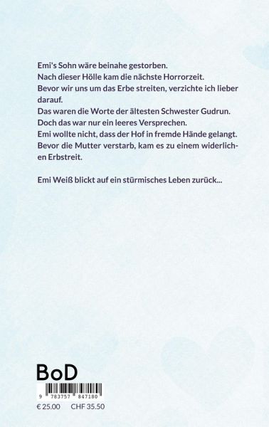 Emi's Sohn wäre beinahe gestorben.Nach dieser Hölle kam die nächste Horrorzeit.Bevor wir uns um das Erbe streiten, verzichte ich lieber darauf. Das waren die Worte der ältesten Schwester Gudrun.Doch das war nur ein leeres Versprechen.Emi wollte nicht, dass der Hof in fremde Hände gelangt.Bevor die Mutter verstarb, kam es zu einem widerlichen Erbstreit.Emi Weiß blickt auf ein stürmisches Leben zurück...