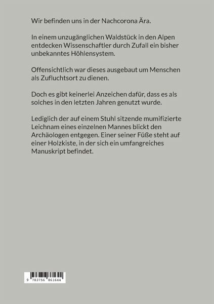 Wir befinden uns in der Nachcorona Ära. In einem unzugänglichen Waldstück in den Alpen entdecken Wissenschaftler durch Zufall ein bisher unbekanntes Höhlensystem. Offensichtlich war dieses ausgebaut um Menschen als Zufluchtsort zu dienen. Doch es gibt keinerlei Anzeichen dafür, dass es als solches in den letzten Jahren genutzt wurde. Lediglich der auf einem Stuhl sitzende mumifizierte Leichnam eines einzelnen Mannes blickt den Archäologen entgegen. Einer seiner Füße steht auf einer Holzkiste, in der sich ein umfangreiches Manuskript befindet.