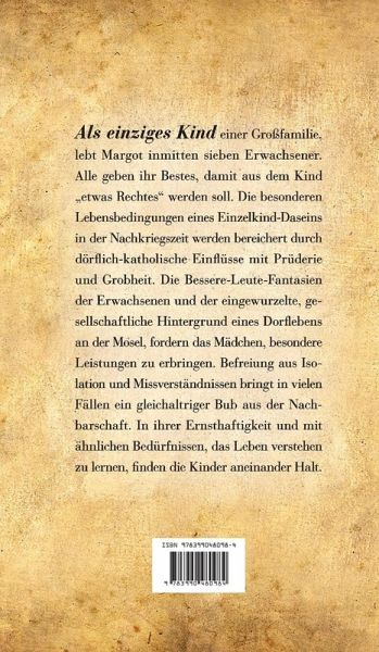 Als einziges Kind einer Großfamilie, lebt Margot inmitten sieben Erwachsener. Alle geben ihr Bestes, damit aus dem Kind "etwas Rechtes" werden soll. Die besonderen Lebensbedingungen eines Einzelkind-Daseins in der Nachkriegszeit werden bereichert durch dörflich-katholische Einflüsse mit Prüderie und Grobheit. Die Bessere-Leute-Fantasien der Erwachsenen und der eingewurzelte, gesellschaftliche Hintergrund eines Dorflebens an der Mosel, fordern das Mädchen, besondere Leistungen zu erbringen. Befreiung aus Isolation und Missverständnissen bringt in vielen Fällen ein gleichaltriger Bub aus der Nachbarschaft. In ihrer Ernsthaftigkeit und mit ähnlichen Bedürfnissen, das Leben verstehen zu lernen, finden die Kinder aneinander Halt.