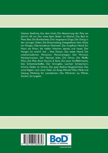 Aus dem Inhalt: Der erste April, Baden im Alkohol, Bananenbrei, Im Bett, Bier, Die Bordtoilette, Brillen, Drei vergessene Dinge, Das Fernsehen ist schuld, Fotografieren, Zu viel Gepäck, Überwundenes Heimweh, Das knopflose Hemd, Ein Hoch am Rhein, Der Hunger, Ich möcht' mal, Kurzschluss, Vom Küssen, Logik, Masochist und Sadist, Müdigkeit, Der Nächste bitte, Nacktschnecken, Die Ohren, Das vergammelte Osterei, Kreative Pausen, Die Pfeife, Eiernde Pole, Der gute Redner, "E Säule", Rosa Brillen, Rose ohne Dornen?, Die teure Schiffsfahrkarte, Schmerzen, Der Schnupfen, Leichter Schwachsinn, Sprachverwirrung, Gestörte Verdauung, Vergesslichkeit, Verwechslung, Das arme Vöglein nach einer Fabel von Äsop, Was sollen wir schenken? Werbung für Lamadecken, Wege zum Glück, Wetter und Politik, Wettleidenschaft, Der Wiedehopf, Das Wörtchen "zu", Die Wüste, Die Zeit, Zu langsam, Zum Geburtstag.