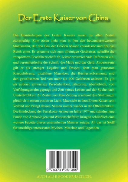 Die Beurteilungen des Ersten Kaisers waren zu allen Zeiten zwiespältig. Zum einen sieht man in ihm den bewundernswerten Staatsmann, der den Bau der Großen Mauer veranlasste und der das Reich einte. Er ernannte sich zum alleinigen Gottkaiser, schaffte die zersplitterte Feudalherrschaft ab, leitete weitreichende Reformen ein, und vereinheitlichte die Schrift, die Maße und das Geld. Andererseits gilt er als strenger Legalist und Despot, dem man grausame Kriegsführung, unzählige Massaker, die Bücherverbrennung und den gewaltsamen Tod von mehr als 400 Gelehrten anlastet. Er gilt als äußerst schwierige Persönlichkeit, jähzornig, überheblich, von Verfolgungswahn geprägt und Zeit seines Lebens auf der Suche nach Unsterblichkeit. Zu Zeiten von Mao Zedong erscheint Qin Shihuangdi plötzlich in einem positiven Licht. Mao sieht in dem Ersten Kaiser sein Vorbild und bringt dessen Namen immer wieder in die Öffentlichkeit. Die Entdeckung der Terrakotta-Armee im Jahre 1974 und ständig neue Funde von Archäologen und Wissenschaftlern bringen schließlich eine weitere Facette dieses erstaunlichen Mannes zutage. All das ist Stoff für unzählige interessante Mythen, Märchen und Legenden.