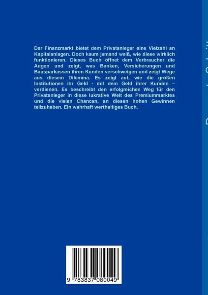 Der Finanzmarkt bietet dem Privatanleger eine Vielzahl an Kapitalanlagen. Doch kaum jemand weiß, wie diese wirklich funktionieren. Dieses Buch öffnet dem Verbraucher die Augen und zeigt, was Banken, Versicherungen und Bausparkassen ihren Kunden verschweigen und zeigt Wege aus diesem Dilemma. Es zeigt auf, wie die großen Institutionen ihr Geld - mit dem Geld ihrer Kunden - verdienen. Es beschreibt den erfolgreichen Weg für den Privatanleger in diese lukrative Welt des Premiummarktes und die vielen Chancen, an diesen hohen Gewinnen teilzuhaben. Ein wahrhaft werthaltiges Buch.