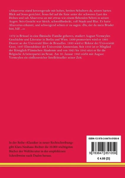In der Reihe »Klassiker in neuer Rechtschreibung« gibt Klara Neuhaus-Richter die wichtigsten Bücher der Weltliteratur in der empfohlenen Schreibweise nach Duden heraus. August Vermeylen: Der ewige Jude »Ahasverus stand kerzengerade mit hohen, breiten Schultern da, seinen harten Blick auf Jesus gerichtet. Jesus fiel auf die Knie unter der schweren Last des Holzes und sah Ahasverus an mit etwas wie einem flehenden Schrei in seinen Augen. Sein Gesicht war bleich, schweißbedeckt, voll Staub und Blut. Er hatte Ahasverus erkannt, und schweigend schien er zu sagen: ¿Du, der du mein Bruder bist, hilf ...¿« »De wandelende Jood«. Entstanden zwischen 1897 und 1906. Erstdruck: Bussum, Van Dishoeck, 1906. Hier in der Übersetzung von Anton Kippenberg, Leipzig, Insel Verlag, 1921, die der veränderten zweiten flämischen Auflage folgt. Neu herausgegeben von Klara Neuhaus-Richter, Berlin 2021. Umschlaggestaltung von Rainer Richter unter Verwendung einer Porträtzeichnung von Josefine Weinschrott. Gesetzt aus der Minion Pro, 11 pt. Henricus - Edition Deutsche Klassik GmbH Über den Autor: 1872 in Brüssel in eine flämische Familie geboren, studiert August Vermeylen Geschichte und Literatur in Berlin und Wien. 1899 promoviert wird er 1901 Dozent an der Université libre de Bruxelles. 1930 wird er Rektor der Universität Gent, 1937 Ehrendoktor der Universität Amsterdam. Seit 1919 ist er Mitglied der Königlich Flämischen Akademie und von 1921 bis 1945 sitzt er für die Belgische Arbeiterpartei im Senat. Am 10. Januar 1945 stirbt mit August Vermeylen ein einflussreicher Intellektueller seiner Zeit.