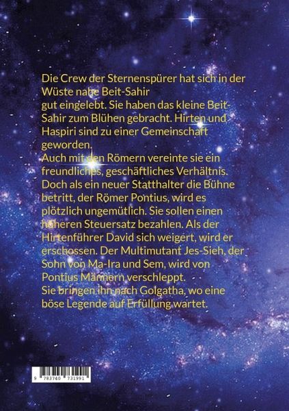 Die Crew der Sternenspürer hat sich in der Wüste nahe Beit-Sahirgut eingelebt. Sie haben das kleine Beit-Sahir zum Blühen gebracht. Hirten und Haspiri sind zu einer Gemeinschaft geworden.Auch mit den Römern vereinte sie ein freundliches, geschäftliches Verhältnis. Doch als ein neuer Statthalter die Bühne betritt, der Römer Pontius, wird es plötzlich ungemütlich. Sie sollen einen höheren Steuersatz bezahlen. Als der Hirtenführer David sich weigert, wird er erschossen. Der Multimutant Jes-Sieh, der Sohn von Ma-Ira und Sem, wird von Pontius Männern verschleppt.Sie bringen ihn nach Golgatha, wo eine böse Legende auf Erfüllung wartet.