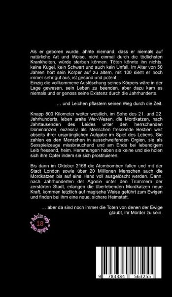 Als er geboren wurde, ahnte niemand, dass er niemals auf natürliche Art und Weise, nicht einmal durch die tödlichsten Krankheiten, würde sterben können. Töten könnte ihn nichts, keine Kugel, kein Schwert und auch kein Unfall. Im Alter von 50 Jahren hört sein Körper auf zu altern, mit 100 sieht er noch immer sehr gut aus, ist gesund und potent...Einzig die vollkommene Auslöschung seines Körpers wäre in der Lage gewesen, sein Leben zu beenden, aber dazu kam es niemals und er genoss seine Existenz durch die Jahrhunderte.... und Leichen pflastern seinen Weg durch die Zeit.Knapp 800 Kilometer weiter westlich, im Soho des 21. und 22. Jahrhunderts, leben uralte Wer-Wesen, die Mordkatzen, nach Jahrtausenden des Leides unter den herrschenden Dominanzen, exzessiv als Menschen fressende Bestien weit abseits ihrer ursprünglichen Aufgabe im Spiel des Lebens. Sie zahlen es den Menschen in ausschweifenden Orgien, sie als Sexspielzeuge missbrauchend und am Ende bei lebendigem Leib fressend, heim. Hemmungen haben sie keine und sie holen sich ihre Opfer indem sie sich prostituieren.Bis dann im Oktober 2168 die Atombomben fallen und mit der Stadt London sowie über 20 Millionen Menschen auch die Mordkatzen bis auf eine Hand voll ausgelöscht werden. Dann, nach Jahrhunderten der Agonie unter den Trümmern der zerstörten Stadt, erlangen die überlebenden Mordkatzen neue Kraft, kommen letztlich auf magische Weise geführt zum Ewigen und finden bei ihm eine neue, sichere Heimstatt.... aber da sind noch immer die Toten von denen der Ewige glaubt, ihr Mörder zu sein.